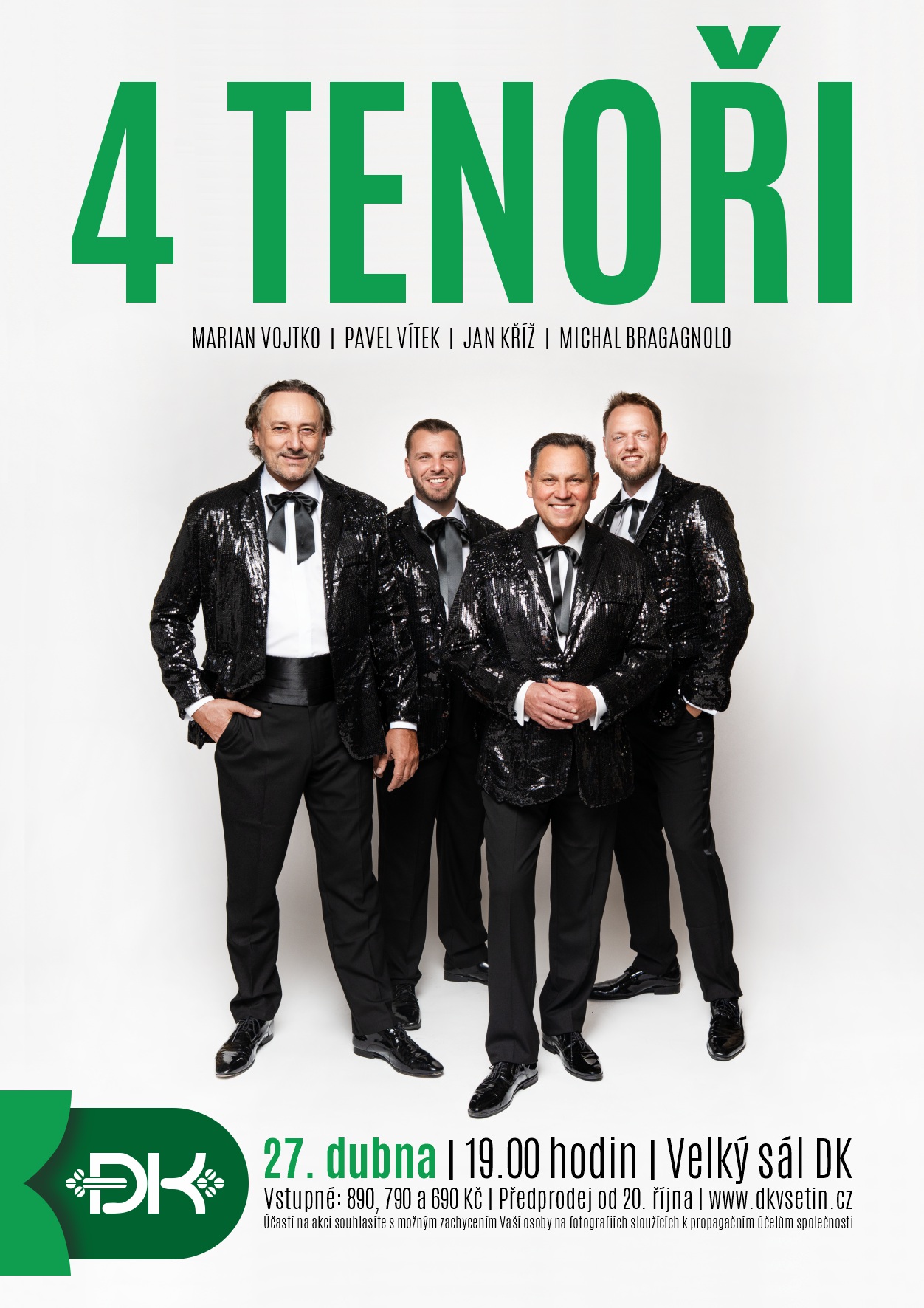 Marian Vojtko, Pavel Vítek, Jan Kříž a Michal Bragagnolo – čtyři výjimečné hlasy, které dohromady tvoří fenomén 4 Tenoři – přijedou na Vsetín s koncertem plným světových i domácích melodií. Koncert za doprovodu orchestru šesti špičkových hudebníků se uskuteční v pondělí 27. dubna 2026 od 19 hodin ve velkém sále Domu kultury Vsetín.